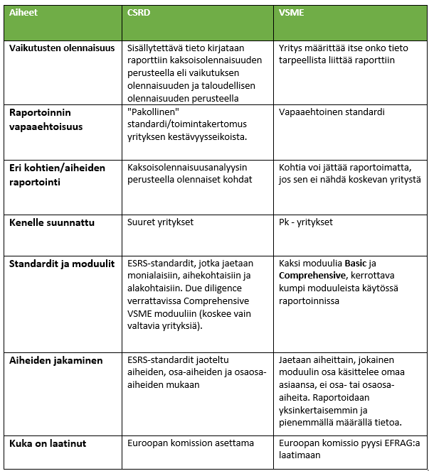 Alla olevassa taulukossa yleisen tason vertailua CSRD ja VSME eroista: